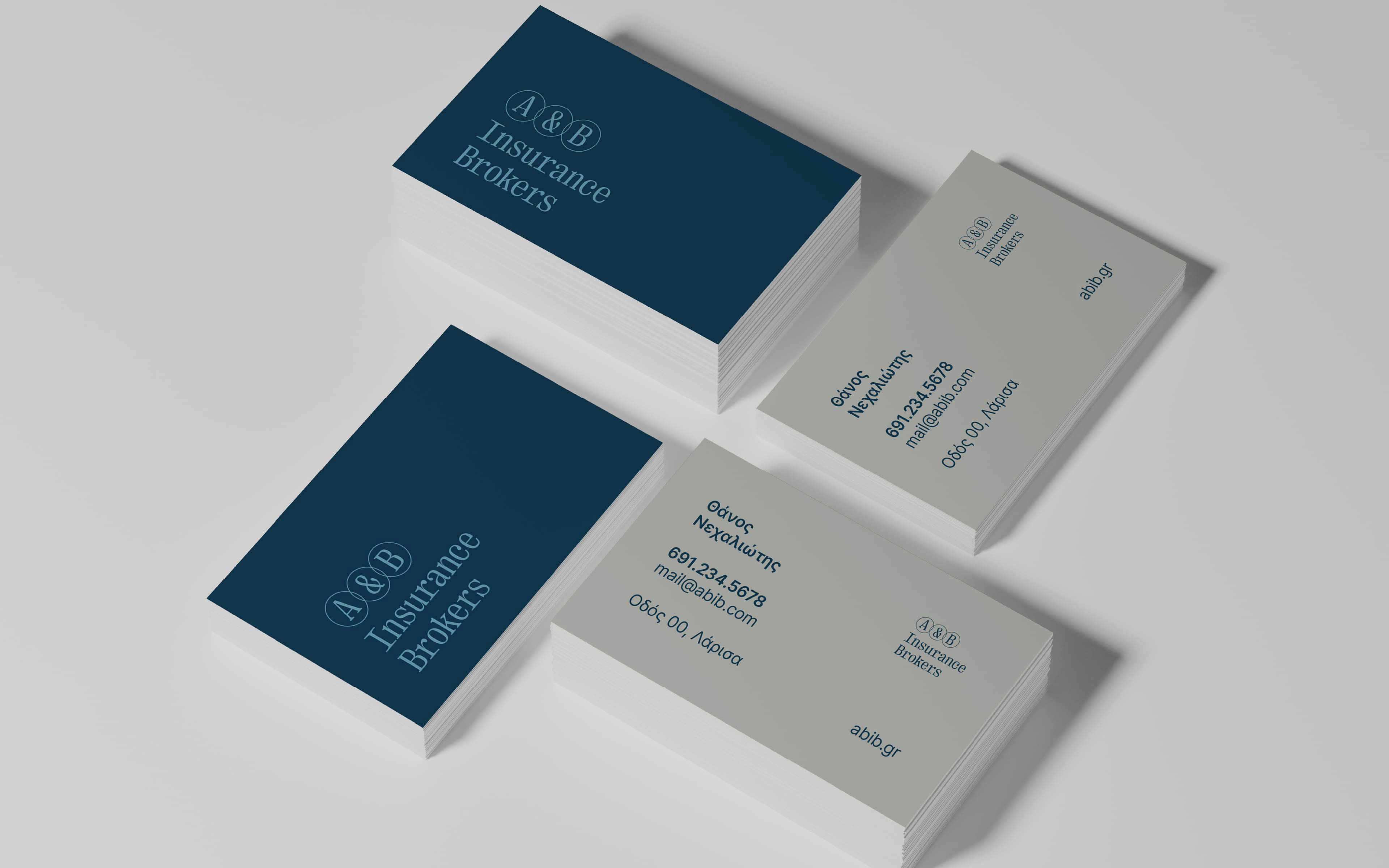Το λογότυπο της A&B δεν είναι απλώς ένα σύμβολο, είναι μια δήλωση. Τρεις κύκλοι που επικαλύπτονται, δύο γράμματα και ανάμεσά τους το & το σύμβολο της σύνδεσης. Κάθε κύκλος είναι ισχυρός μόνος του, αλλά στο σημείο που συναντώνται, γεννάται κάτι ισχυρότερο. Αυτή είναι η ουσία της εταιρείας σε μορφή. Δύο δυνάμεις που δεν μάχονται για χώρο, συνεργάζονται. Η τυπογραφία, ο βαθύς μπλε χρωματισμός, ο χώρος που αφήνουμε γύρω από κάθε στοιχείο όλα συνθέτουν ένα μήνυμα. Δεν είναι το μπλε της τεχνολογίας ή της ταχύτητας. Είναι το μπλε της σταθερότητας, της σοβαρότητας, της ηρεμίας.